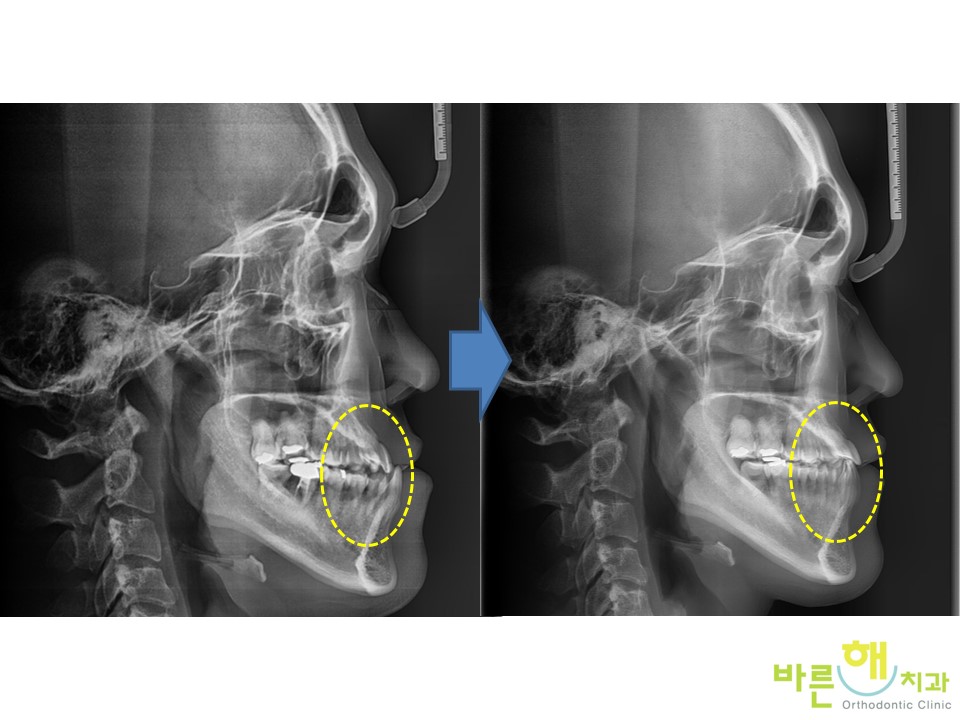 ½ÉÇÑ ¾È¸éºñ´ëΰú ½ÉÇÑ ÁÖ°ÆÅÎÀ» ÁÖ¼Ò·Î ¹Ù¸¥ÇØÄ¡°ú¿¡ ³»¿øÇÏ¿´½À´Ï´Ù. ¾Æ·¡ÅÎÀÌ ¿À¸¥ÂÊÀ¸·Î ¸¹ÀÌ Æ²¾îÁ® ÀÖ°í ¹Ý´ë·Î ¹°¸®´Â Á¤µµ°¡ ½ÉÇѵ¥¿ä. ¾ç¾Ç¼ö¼úÀÌ ¾Æ´Ï´õ¶óµµ ºñ¼ö¼ú ÁÖ°ÆÅÎ ±³Á¤Ä¡·á·Î ÁÁÀº Ä¡·á°¡ °¡´ÉÇÒ±î¿ä? Ä¡¾Æ´Â ¾ÈÂÊÀÇ Çô¿Í ¹Ù±ùÂÊÀÇ ÀÔ¼ú »´ÀÌ ±ÕÇüÀ» ÀÌ·é °÷¿¡ À§Ä¡Çϰí ÀÖ½À´Ï´Ù. ÀϹÝÀûÀ¸·Î ÁÖ°ÆÅÎÀÌ ½ÉÇÑ ºÐµéÀÇ °æ¿ì ÄÚ°¡ ¾ÈÁÁ°Å³ª µîÀÇ ÀÌÀ¯·Î º»Àεµ ¸ð¸£°Ô »ì¦ ÀÔ¼úÀ» ¹ú¸°Ã¤·Î ÀÖ´Â °æ¿ì°¡ ÈçÇѵ¥¿ä. ÀÔ¼úÀ» »ì¦ ¹ú¸®°Ô µÇ¸é Çô°¡ ¹ØÀ¸·Î ³»·Á°¡°Ô µÇ°í ³»·Á°£ Çô°¡ ¾Æ·¡ Ä¡¿À» ÀüÈÄ, Á¿ì·Î ¹Ð¾î³»°Ô µÇ¾î Á¡Á¡ ´õ ½ÉÇÑ ÁÖ°ÆÅÎÀ¸·Î ¹ßÇöµÇ°Ô µË´Ï´Ù. µû¶ó¼ Ç×»ó ÀÔ¼úÀ» ´Ù¹°°í, ÄڷΠȣÈíÇϰí, Çô°¡ ÀÔõÀå¿¡ ºÙ¾îÀִ ä·Î À¯ÁöµÇ´Â °ÍÀÌ Áß¿äÇÕ´Ï´Ù. ÀÌ·¯ÇÑ Çô¿Í °ü·ÃµÈ ÁÁÀº ±¸°½À°üÀ» Çü¼ºÇÏ´Â ÈÆ·ÃÀ» ±¸°±Ù±â´ÉÈÆ·Ã (Oral myofunctonal therapy, MFT) ¶ó°í ÇÕ´Ï´Ù. ½ÉÇÑ ÁÖ°ÆÅÎ ¹× ½ÉÇÑ ¾È¸éºñ´ëĪÀ¸·Î ³»¿øÇÏ¿´°í ºñ¼ö¼ú ÁÖ°ÆÅÎ ±³Á¤Ä¡·á¸¦ ÁøÇàÇϰí ÀÖ½À´Ï´Ù. ½ÉÇÑ ¹Ý´ë±³ÇÕÀÌ ¾Õ´Ï³¢¸® ¸Â´ê´Â Á¤µµ±îÁö °³¼±µÈ °ÍÀ» º¼ ¼ö ÀÖ½À´Ï´Ù. ½ÉÇÑ ÁÖ°ÆÅÎÀÌ °³¼±µÇ¸é¼ À§¾Æ·¡ ¾Õ´Ï°¡ Á¤»óÀûÀ¸·Î ±³ÇÕµÇ°Ô ¹Ù²ï °ÍÀ» º¼ ¼ö ÀÖ½À´Ï´Ù¸¸ ¾ÆÁ÷Àº ±³ÇÕÀÌ ºÒ¾ÈÀüÇÑ »óÅÂÀÔ´Ï´Ù. ¿À¸¥ÂÊ ¾î±Ý´Ï°¡ À¯Âø(Ankylosis)ÀÌ ÀÖ¾î ¿òÁ÷ÀÌÁö ¸øÇÏ´Â °ÍÀÌ È®ÀεǾú½À´Ï´Ù. ¾î±Ý´Ï´Â Áß¿äÇÑ Ä¡¾Æ·Î ±³Á¤Ä¡·á½Ã¿¡ ¿òÁ÷ÀÓÀÌ Àß Á¶ÀýµÇ¾ß ÇÏÁö¸¸ À¯Âø(Ankylosis)ÀÌ µÈ Ä¡¾ÆÀÇ °æ¿ì ¿òÁ÷ÀÏ ¼ö ¾ø±â ¶§¹®¿¡ Á¦¿ÜÇÏ°í ¸¶¹«¸® ±³Á¤Ä¡·á¸¦ ÁøÇàÇϱâ·Î ÇÏ¿´½À´Ï´Ù.